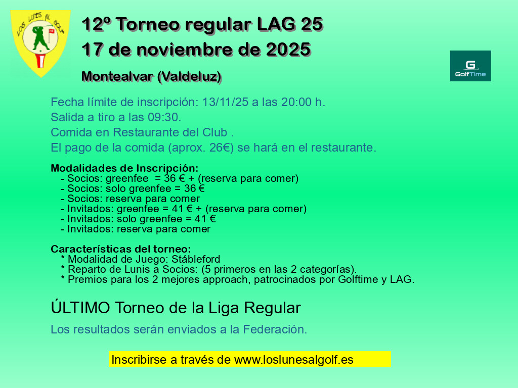 - En caso de causar baja durante el plazo de inscripción deberá hacerse a través de la web. Si es posterior al cierre de la inscripción, deberá comunicarse lo antes posible a competicionloslunesalgolf@gmail.com. En este caso no podemos garantizar que se devuelva lo pagado.