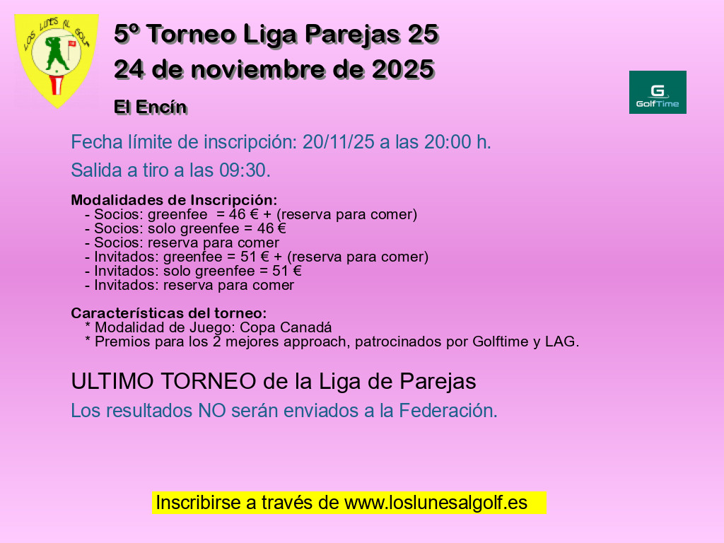 - En caso de causar baja durante el plazo de inscripción deberá hacerse a través de la web. Si es posterior al cierre de la inscripción, deberá comunicarse lo antes posible a competicionloslunesalgolf@gmail.com. En este caso no podemos garantizar que se devuelva lo pagado.