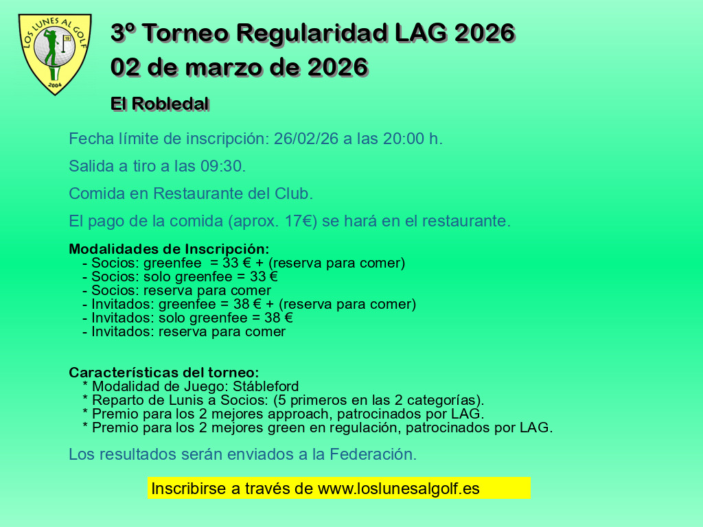 - En caso de causar baja durante el plazo de inscripción deberá hacerse a través de la web. Si es posterior al cierre de la inscripción, deberá comunicarse lo antes posible a competicionloslunesalgolf@gmail.com. En este caso no podemos garantizar que se devuelva lo pagado.